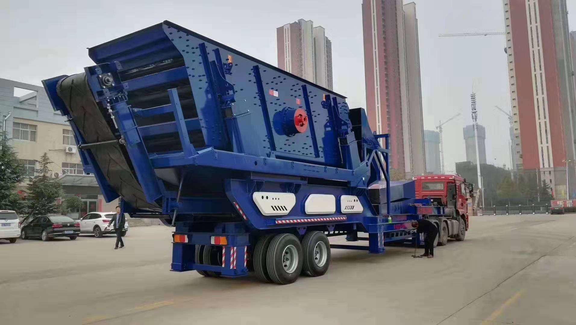 这次发往广东的是一套时产150吨的移动式破碎站,客户原料是建筑垃圾,成品为4cm以下的混合料,筛子的筛网采用的规格是40mm的孔径,较上层的筛上物通过皮带机再返回到破碎车上进行破碎,筛下成品用皮带机送至成品料堆。