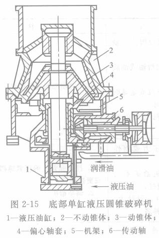 图2-15为底部单缸液压圆锥破碎机构造图。可动锥体3的主轴下端插入偏心轴套4中,并支撑在油缸活塞上面的球面圆盘上,活塞下面通入高压油用于支撑活塞。由于偏心轴套的转动,从而使动锥体作锥面运动。